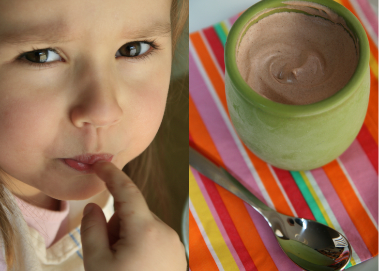Puis il faut une fillette super motivée mais ça c’est facile j’ai cela en rayon à la maison. Depuis qu’elle sait tenir une cuillère chouchou est toujours partante pour cuisiner avec maman. Aujourd’hui, du haut de ses 4 ans, elle manie le batteur électrique comme une pro. La préparation de cette glace et tellement simple que chouchou l’a réalisé toute seule. Elle a fait la mesure de lait, vidé le sachet, battue la préparation, tamisé le chocolat et remixé le tout. Je l’ai simplement aidé pour la mise en pot et la vaisselle bien sure !