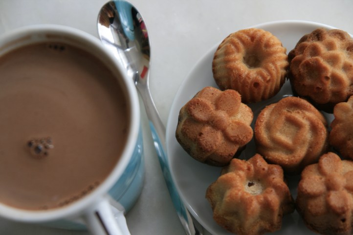 On peut servir ce gâteau saupoudré de sucre glace pour mettre en valeur les dessins des moules utilisés. Si il est bien doré, on peut aussi le proposer tel quel avec un chocolat chaud c’est excellent.