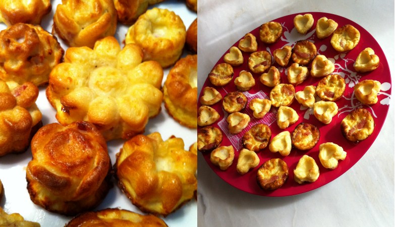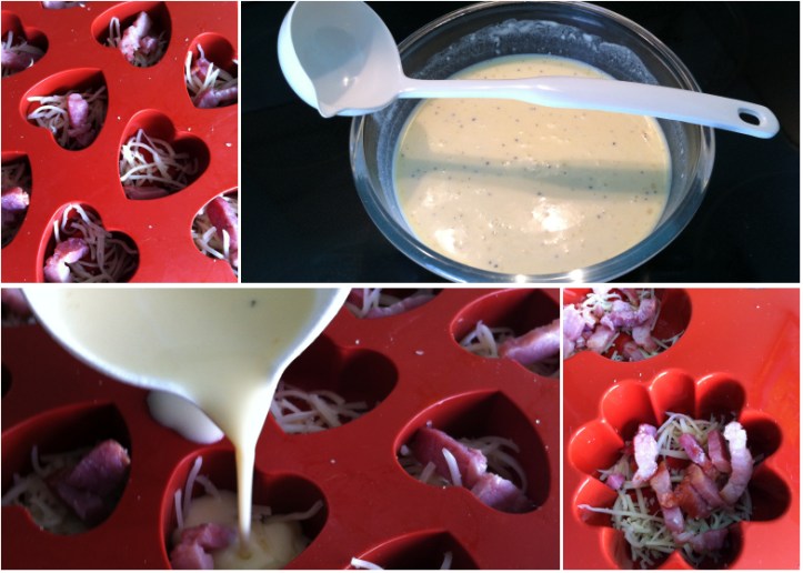 - Remplir les mini moules de lardons et d’emmental râpé