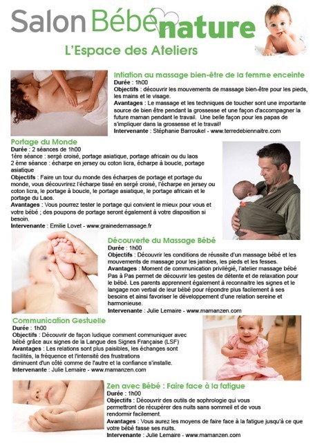 - Ateliers divers et gratuits (découverte du massage bébé, portage du monde, massage bien-être de la futur maman, communication avec bébé grâce à la langue des signes, utilisation de la sophrologie pour rester zen). Pour participer à ces ateliers il ne faut pas oublier de s’inscrire rapidement en envoyant un e-mail)