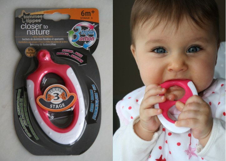 – Pour Rose et son bout’choux de 6 mois un hochet de dentition Tommee Tippee Stade 3 rose.