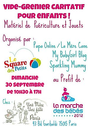 Comme ils ne manquent pas d’énergie ces même blogueurs lancent aujourd’hui un vide grenier caritatif avec l’organisation Square des Petits (site gratuit d’annonces de matériel de puériculture et de jouets d’occasion pour enfants)