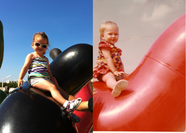 Pour finir, un petit clin d’œil à mes souvenirs d’enfance en vacances à Port Barcares (dans ma super petite robe imprimé très wizz) où nous sommes retournés en 2010 avec notre chouchou qui pause au même endroit !