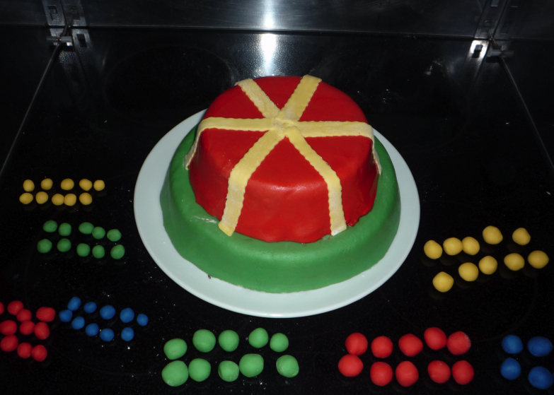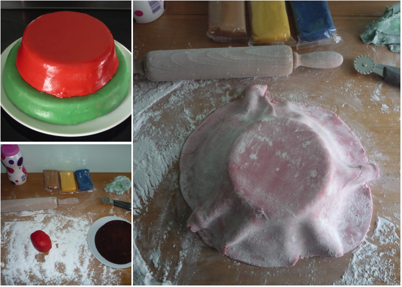 Pour recouvrir entièrement le petit gâteau rond de 19 cm de diamètre et d’une épaisseur de 8 cm d’épaisseur, j’ai choisi le rouge. Il faut prévoir 500g de pâte à sucre.