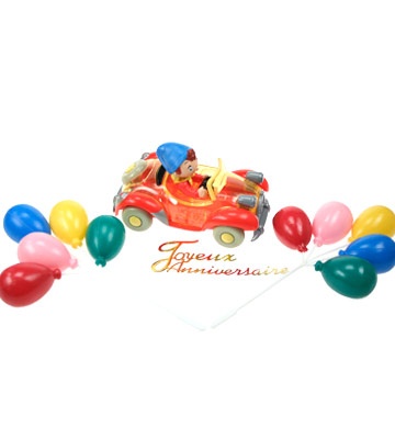 Pour finir il suffit d’ajouter son kit de décoration. Celui que j’ai sélectionné se compose de ballons en plastiques et d’un petit Oui Oui dans sa voiture. Je l’ai commandé en ligne sur le site Cerf Dellier qui propose toujours un kit équivalent. On peut aussi utiliser une figurine en plastique comme celle de Papo qui mesure 17 cm. L’avantage de ce deuxième choix c’est que votre enfants pourra garder ce jouet. Lansay propose aussi une petite voiture Oui-Oui pousse & go de 12 cm qui peut convenir également.