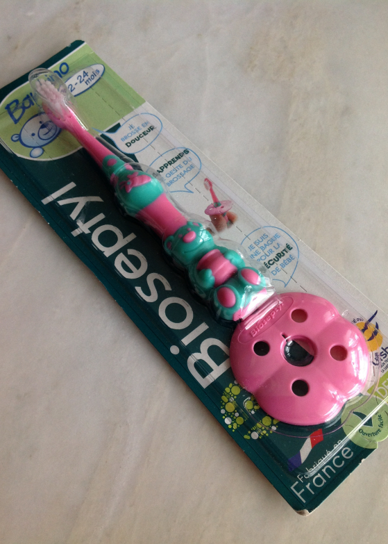 Il existe plusieurs modèles mais je préfère ceux sur lesquels on peut ajouter une collerette comme celui de Bioseptyl. La collerette est importante car grâce à elle bébé ne peut pas enfoncer la brosse trop loin dans la bouche. Le manche doit être assez facile à prendre en main. Le poil de ces brosses à dents est extrêmement souple donc bébé ne pourra pas se blesser.