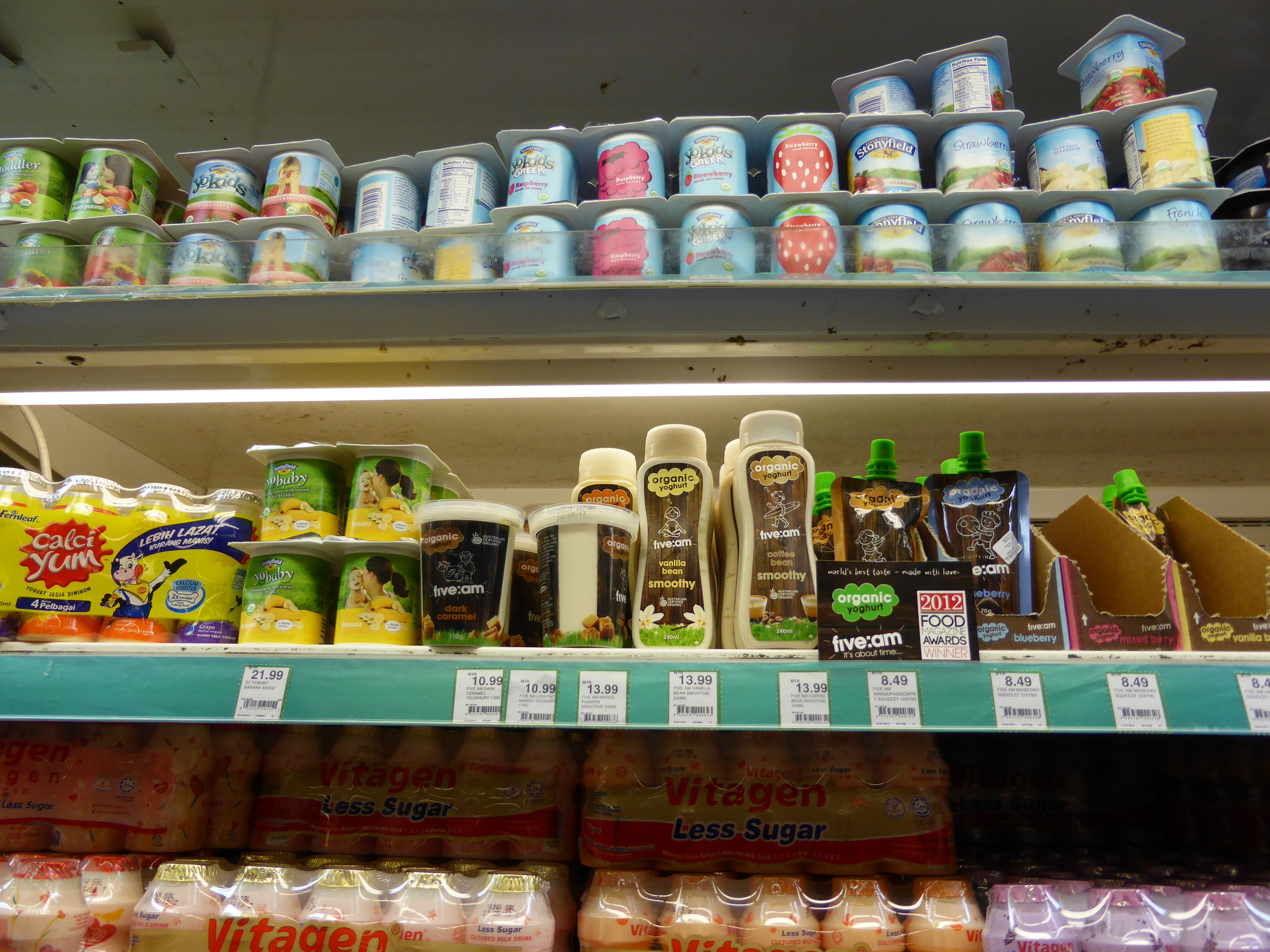 Au rayon frais, nous avons découvert plusieurs marques de yaourts spécifiques pour enfants et pas mal de produits bio. La marque que nous avons retrouvé partout en Malaisie et à Singapour c’est la Néo Zélandaise CalciYum avec sa petite vache rigolotte. Il faut dire qu’en Malaisie, il n’y a pas vraiment de vache à lait. Tous les produits laitiers (yaourts, lait et beurre) que nous avons mangés provenaient de Nouvelle Zélande.