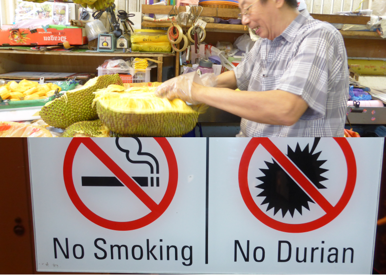 découpe du durian sur le marché – interdiction du fruit dans certains lieux (restaurants, métro de Singapour, hôtel)