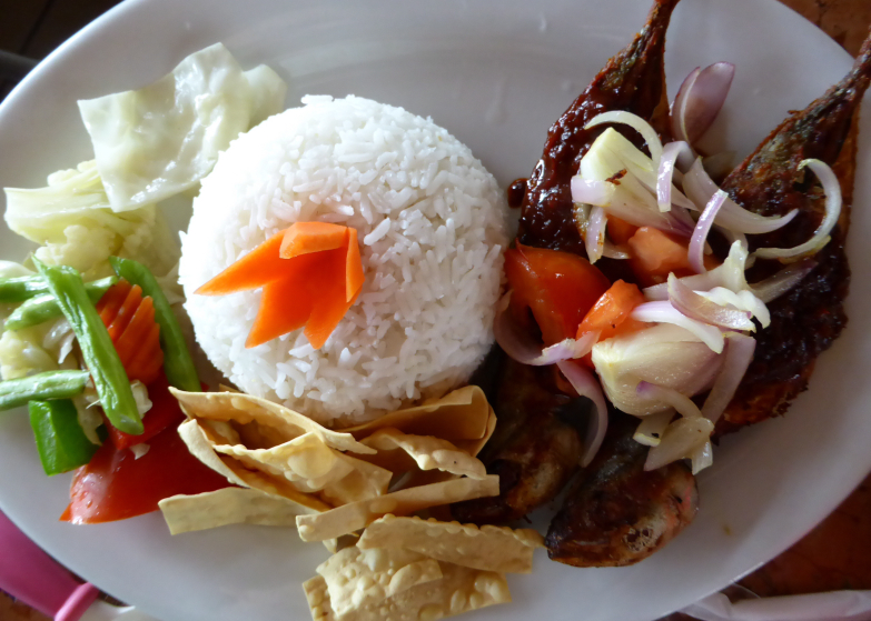 Nous avons continué notre découverte des plats malaisiens typiques. Nous avons eu l’occasion de goûter au Ikan Pedas Mempelai. Très épicé (pimenté) ce met se compose de poisson braisé aux herbes et épices accompagné d’une sauce coco. Il est servi avec du riz vapeur et des légumes sautés. Je n’ai malheureusement pas la recette.
