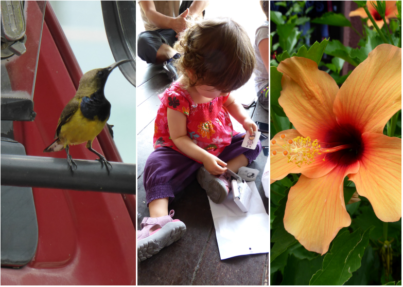 L’île de Tioman est recouverte d’une épaisse forêt tropicale. Les essences qui la compose sont très variées. La faune qui peuple la forêt est aussi intéressante. Il est possible d’organiser des randonnées menant au cœur de l’île parfois jusqu’à des cascades mais notre première expérience l’été dernier avec les enfants ne nous pas encouragé à renouveler l’expérience ici sur un sol encore plus accidenté et humide. Nous avons toutefois pu leur montrer un certain nombre de plantes et de fleurs que notre grande a pu dessiner sur son carnet de croquis.
