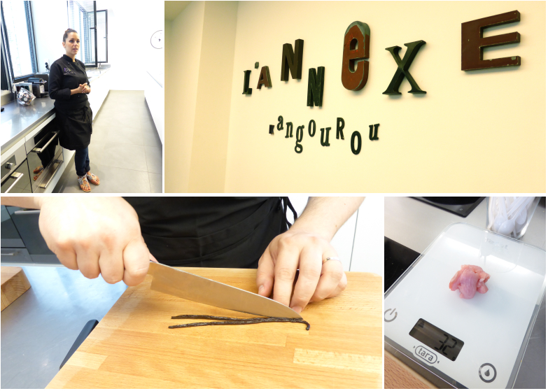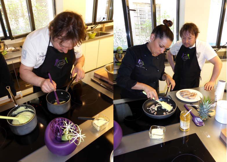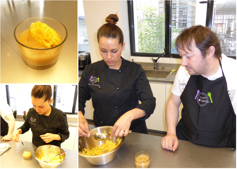 La cuisine c’est un peu technique mais avec Céline cela devient un jeu d’enfants comme la réalisation de petites quenelles de mangue et ananas ou la préparation d’une béchamel.