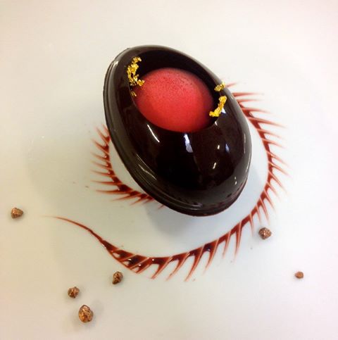 Un entremet composé de choux, d’une brunoise exotique, de chocolat et de chantilly mascarpone et vanille.