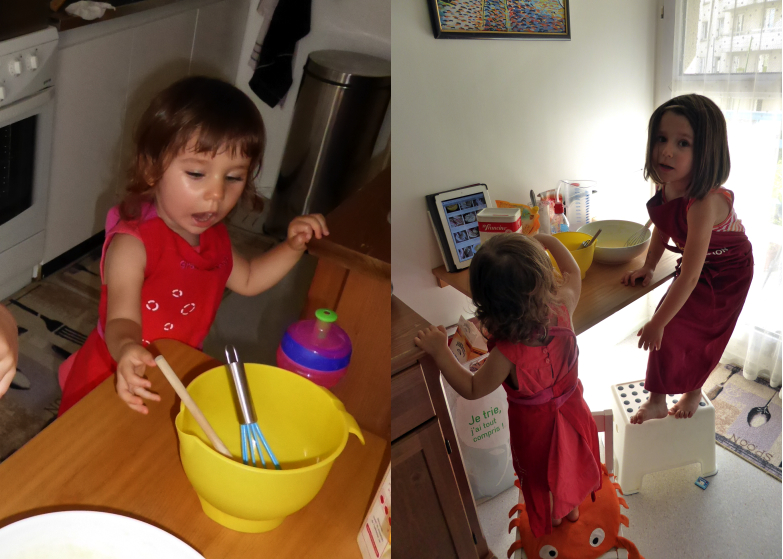 Depuis peu, c’est notre petite dernière qui a montré un intérêt pour nos activités pâtisserie du mercredi. Vous auriez du voir le large sourire qui s’est dessiné sur son visage lorsque je lui ai proposé de venir préparer des gâteaux avec nous. Elle était si fière d’enfiler le petit tablier de sa grande sœur tout juste à sa taille.