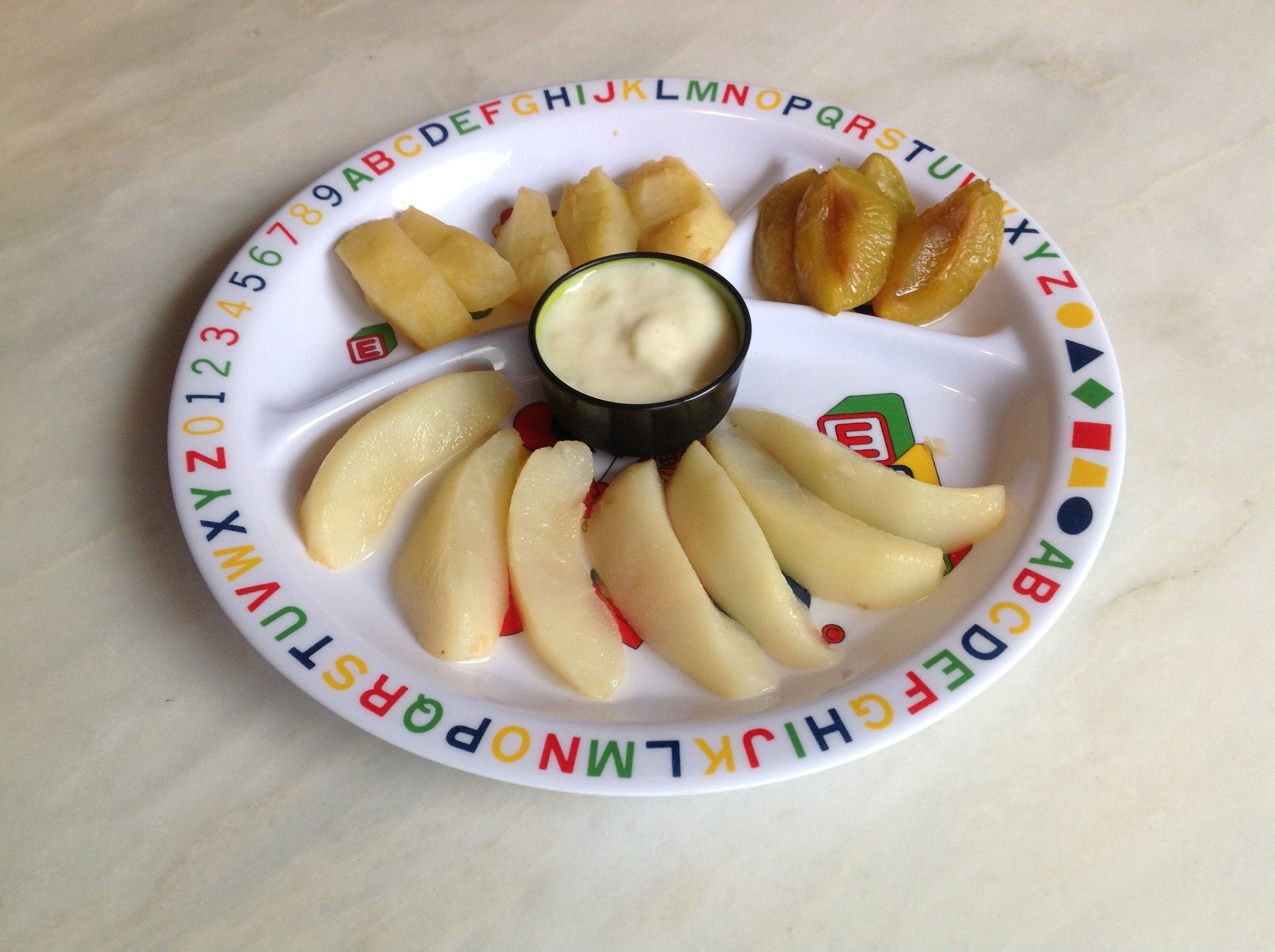 • C’est pas mon idée et j’étais même septique à donner des bâtonnets de fruits cuits mais à ma grande surprise ça plait beaucoup à ma puce surtout avec le yaourt dans lequel il faut tremper les fruits 😉