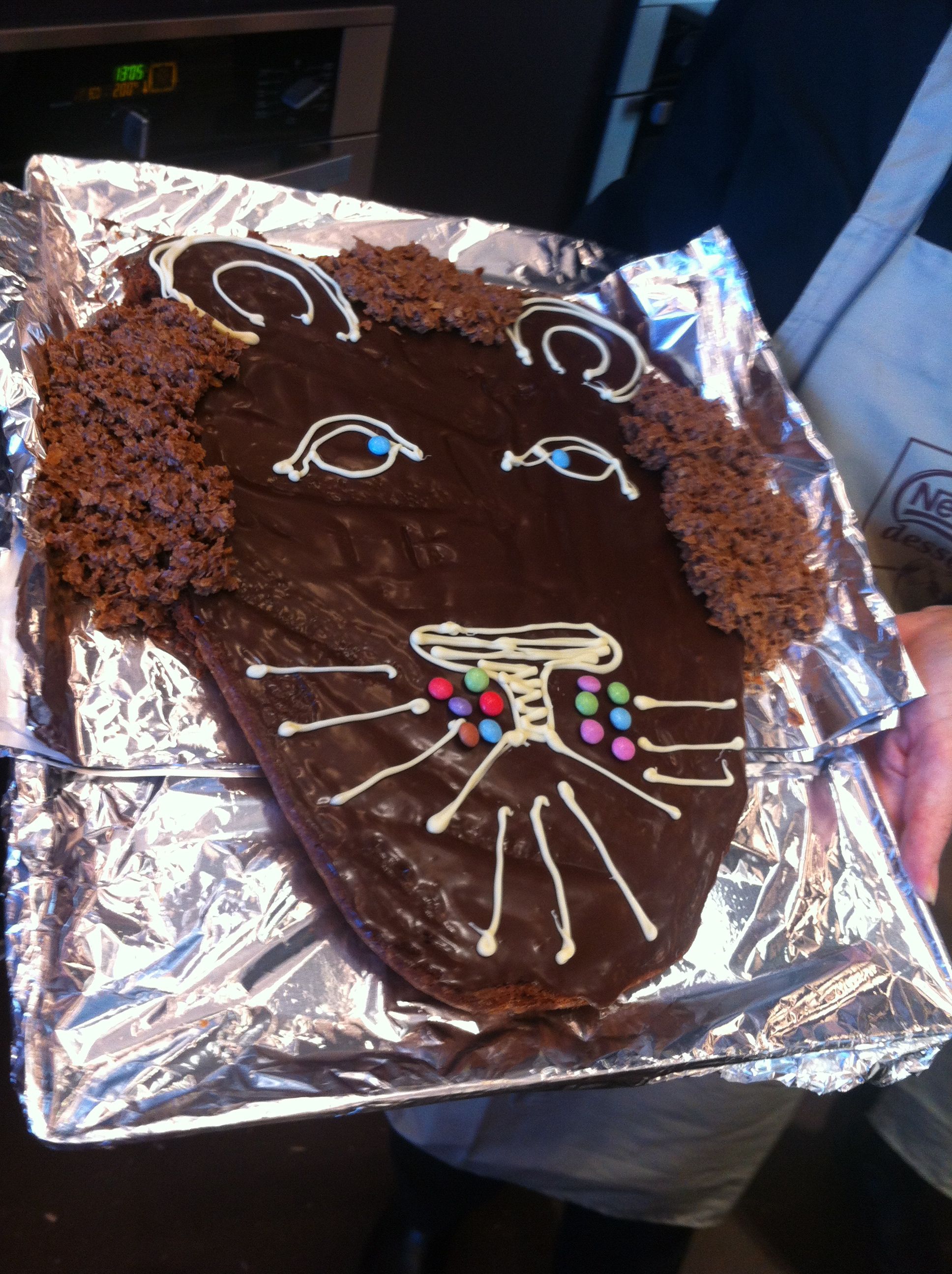 1. Préchauffez votre four à 200 degrés C (Thermostat 7) en mode traditionnel. Dans un saladier, faites fondre les mini-palets de chocolat Nestlé Dessert de la préparation pour moelleux Nestlé Dessert avec le beurre pendant environ 2minutes30 au four à micro-ondes à 500 watts ou un peu plus longtemps au bain marie. Remuez le tout pour obtenir un mélange homogène puis incorporez le deuxième sachet de la préparation et les œufs. Beurrez et farinez une plaque à biscuit puis versez la préparation en formant la tête d’un lion (une forme de poire inversée). Enfournez pour 16 minutes. Laissez refroidir à la sortie du four et renversez le gâteau sur une plaque recouverte de papier d’aluminium. Redécoupez si besoin la tête du lion pour former de belles oreilles.