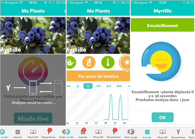 Depuis quelques semaines, je peux suivre à partir de l’application que j’ai installée sur mon i-phone, la luminosité, l’humidité, le taux d’engrais et l’ensoleillement de mon pied de myrtille. C’est assez bluffant. Ce que j’apprécie c’est de recevoir des alertes lorsque ma plante a besoin d’engrais. Le seul hic c’est que je trouve que deux alertes en 15 jours c’est un peu beaucoup.