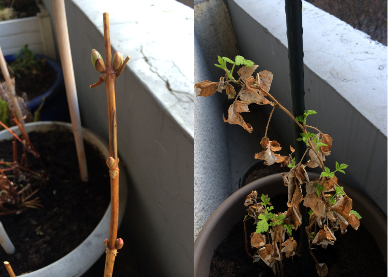 Les premiers boutons ont fait leur apparition et nous avons été très contentes de constater que notre opération de séparation entre les framboisiers et la clématite était un succès puisque les framboisiers sont couverts de petites feuilles. Espérons qu’il ne gèle pas d’ici le printemps.