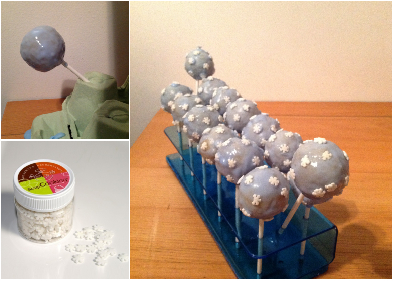 2. Plongez chacun des pop-cakes dans le nappage et déposez les sur le support. Ajoutez quelques flocons en sucre avant que le nappage durcisse.