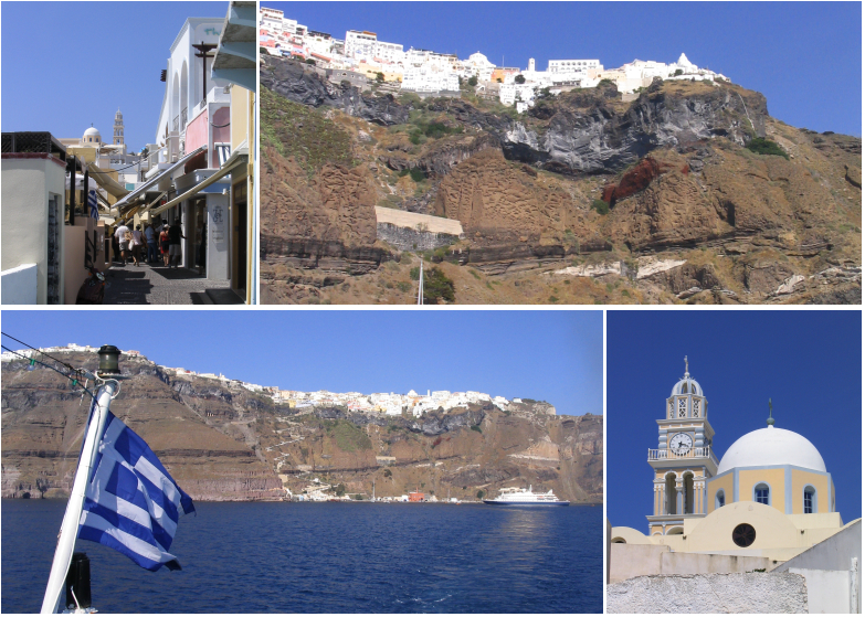 L’arrivée se fait la côte sud où se dressent de magnifiques falaises sur lesquelles est juchée la ville de Thira ou Fira. On voit très distinctement ses maisons blanches en haut de cette muraille naturelle. La montée se fait au choix à pieds ou à dos de mulets.