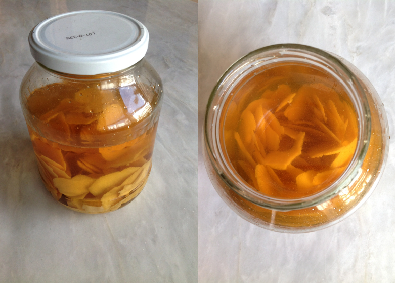 2. Déposez les morceaux dans un bocal et couvrez les d’alcool avant de le refermer hermétiquement.
