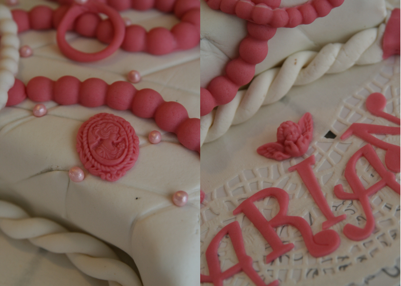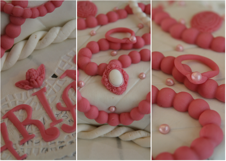 Comme j’avais de la pâte à sucre rose et quelques moules à la maison, je me suis lancée dans la réalisation d’un gâteau inspiré de ce modèle. Voici quelques images du résultat final en attendant la publication du tutoriel que je vous prépare.