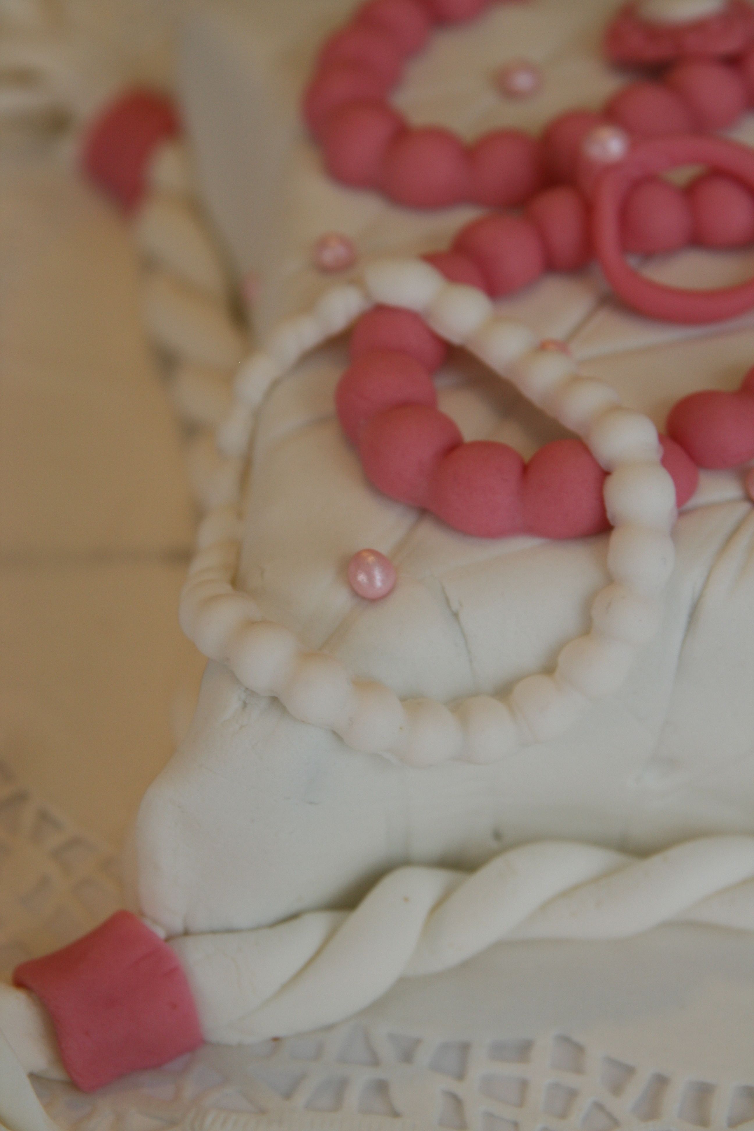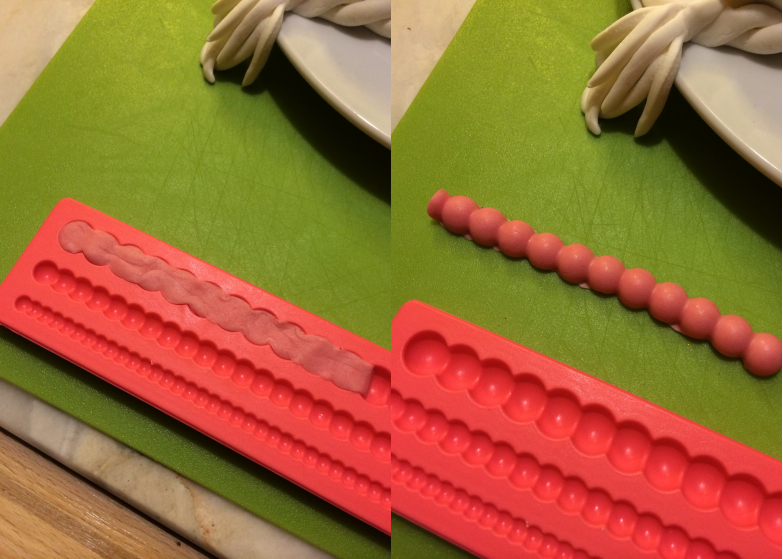 Comme je vous l’expliquais précédemment, on peut tout à fait réaliser un collier ou un bracelet de perle sans moule. Pour cela il suffit de former un boudin de pâte à sucre fin et de le découper en petites parties égales les unes aux autres puis de rouler la pâte sur le tapis. C’est un travail assez long mais le résultat est bon.