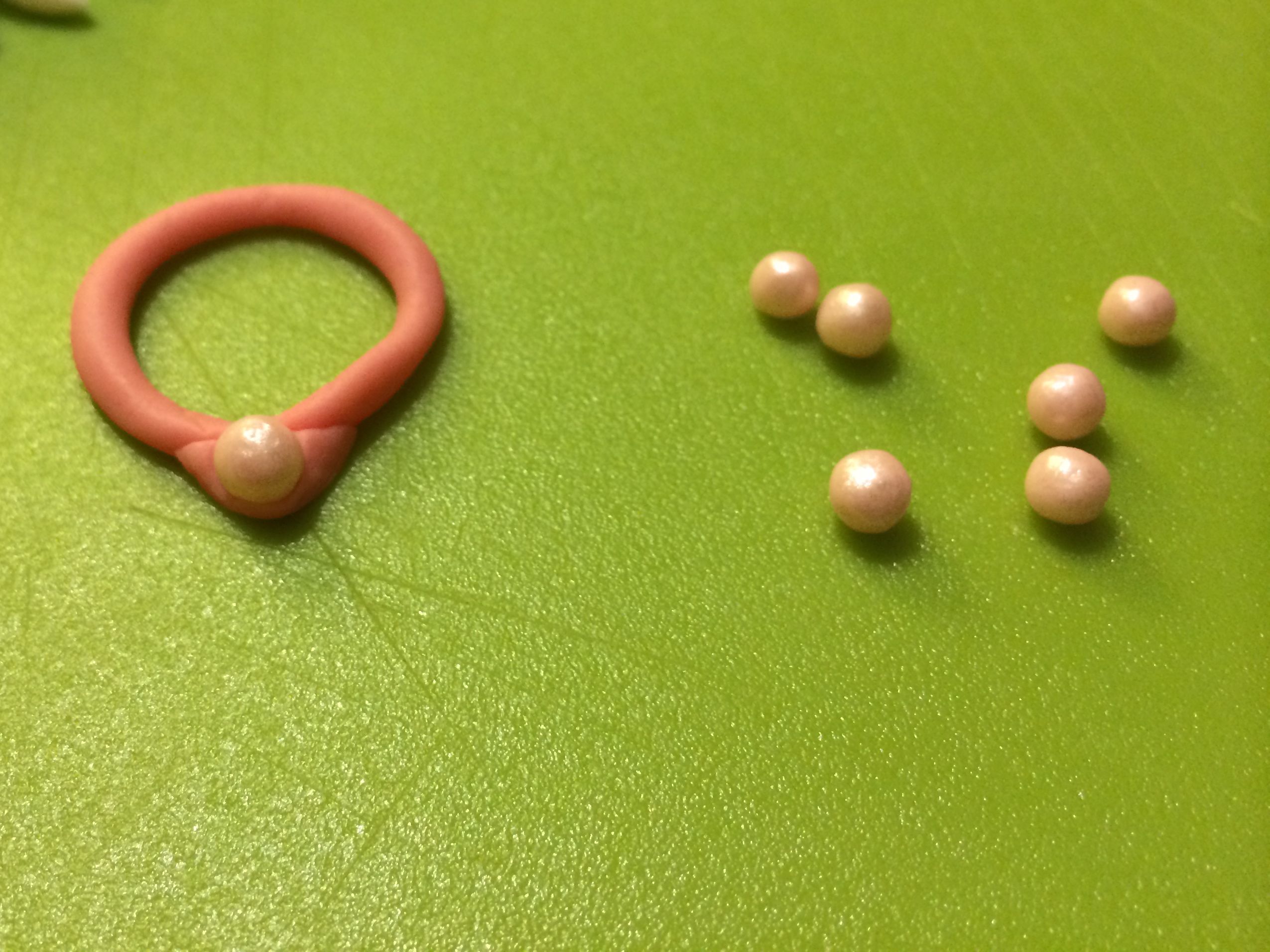 J’avais envie d’ajouter une petite bague fine à cet ensemble de bijoux, j’ai donc opté pour un solitaire avec une perle nacrée. Pour cela il suffit simplement de préparer un petit boudin de pâte à sucre de l’entourer autour d’un doigt pour lui donner sa forme d’anneau et d’ajouter une perle.