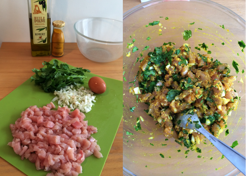 1. Hachez finement les blancs de dinde. Pelez et hachez l’oignon. Lavez, séchez et hachez la coriandre.