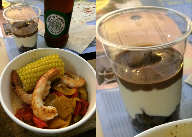 En plat principal, j’ai choisi des crevettes Qwehli King Prawns à l’ail accompagnées de maïs et de poivrons. Pour le dessert, j’ai craqué pour la verrine de chocolat Milo avec des éclats de brownies et des noix de macadamia.