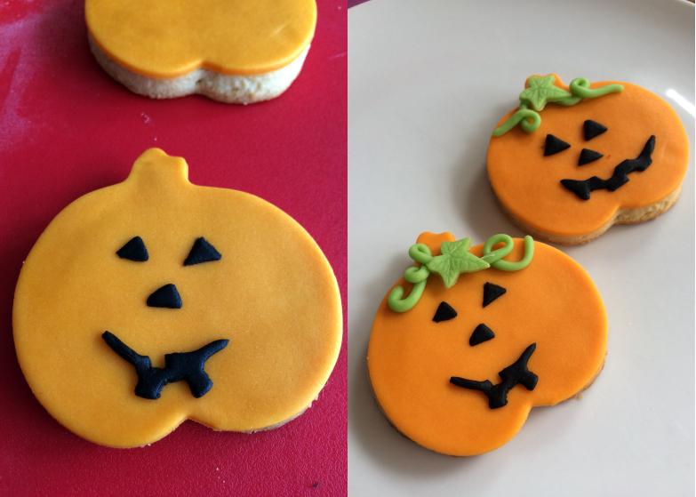 Pour la citrouille, j’ai procédé de la même manière mais avec de la pâte à sucre orange.