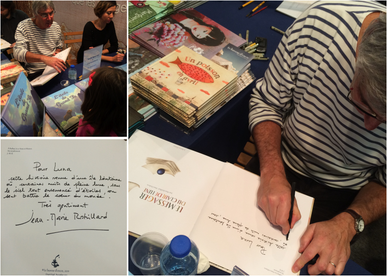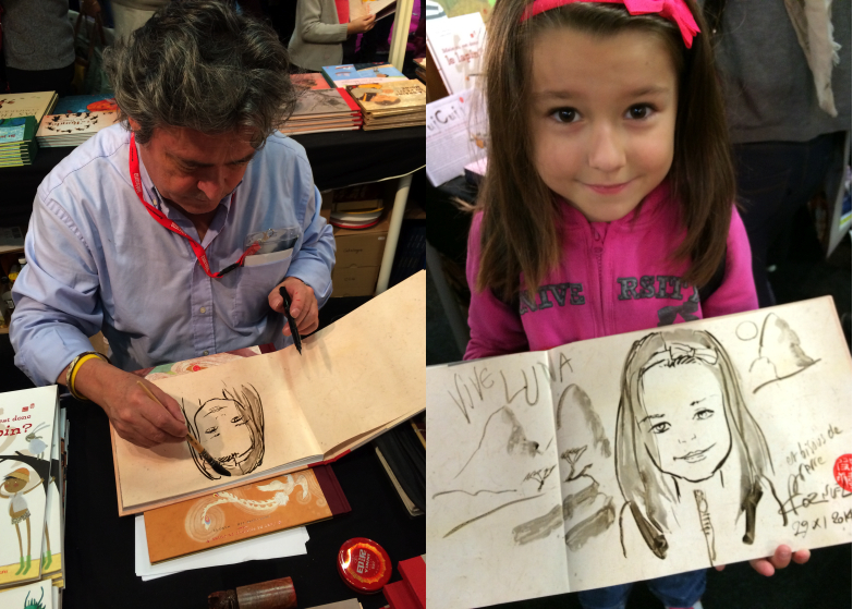 Nous avons eu le plaisir de le rencontrer au salon et lui avons demandé une petite dédicace sur son dernier ouvrage, un fabuleux livre-frise qui déplié mesure environ 10 mètres et voici ce qu’il a réalisé pour ma puce qui était ravie de le voir travailler. Elle qui aime tant dessiner.
