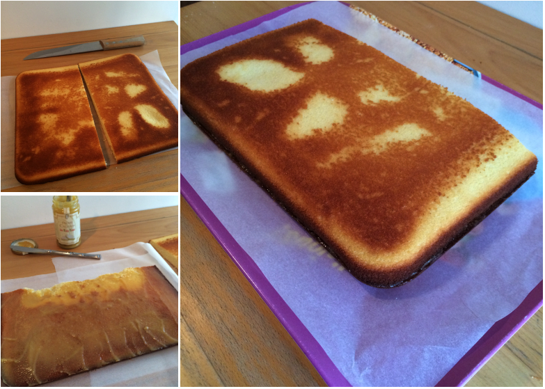 Pour ma base de gâteau, j’ai utilisé un gâteau au yaourt parfumé à la vanille que j’ai fait cuir dans un grand plat rectangulaire aux dimensions suivantes : 36 x 18 x 5 cm.