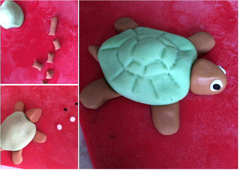 Tuto-LDDA_Gateau-valise-voyage-14En résumé, on forme un boudin que l’on redécoupe en 6 morceaux (4 égaux pour les pattes, un plus petit pour la queue et un plus grand pour la tête). Pour la carapace, j’ai utilisé une petite boule de pâte à sucre verte que j’ai mis en forme à la main et sur laquelle j’ai dessiné quelques marques au couteau. Pour les yeux, j’ai préparé deux petites boules de blanc et deux encore plus petites de noir. On fixe les membres, la tête, la queue et les yeux par pression.