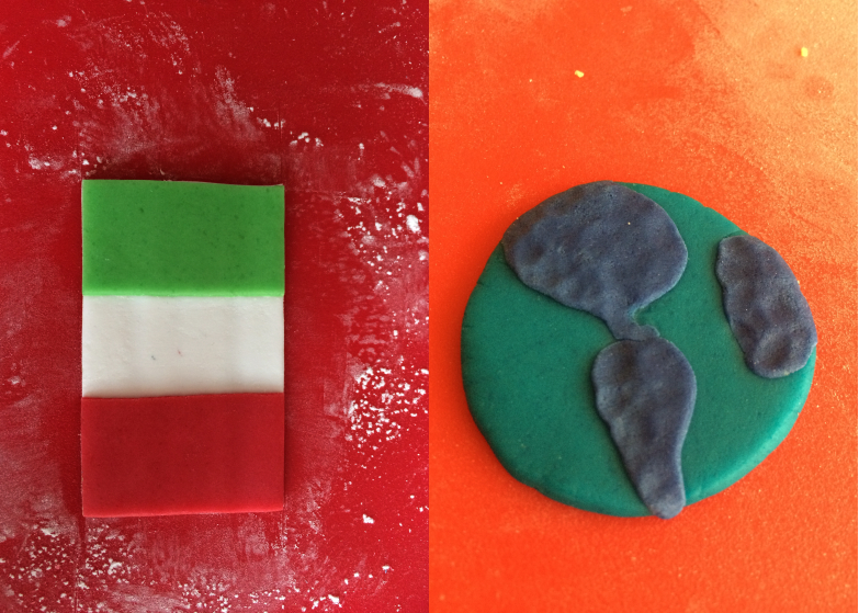 Pour le drapeau italien, j’ai utilisé de la pâte à sucre blanche sur laquelle j’ai choisi de poser deux rectangles de couleurs rouge et verte. Pour le drapeau Allemand j’ai procédé de même avec de la pâte à sucre noire, jaune et rouge. J’ai effectué mes découpes avec un couteau de cuisine à l’aide d’une règle.