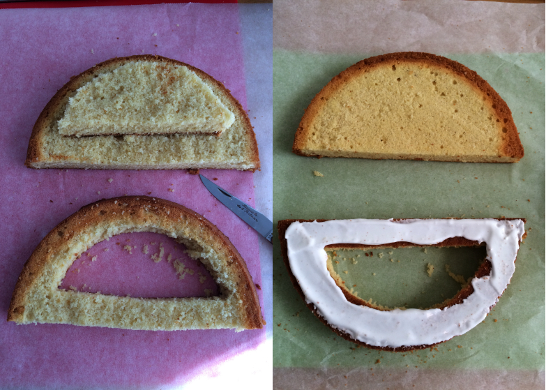 J’ai découpé l’intérieur de deux moitiés de gâteaux comme sur la photo ci-dessous en formant un demi-cercle.