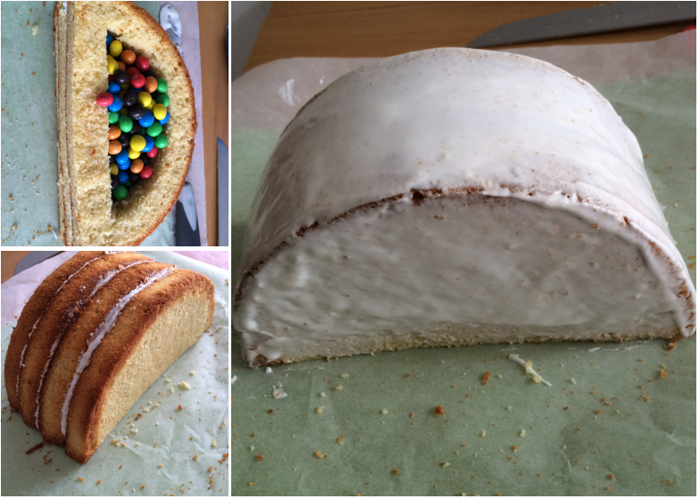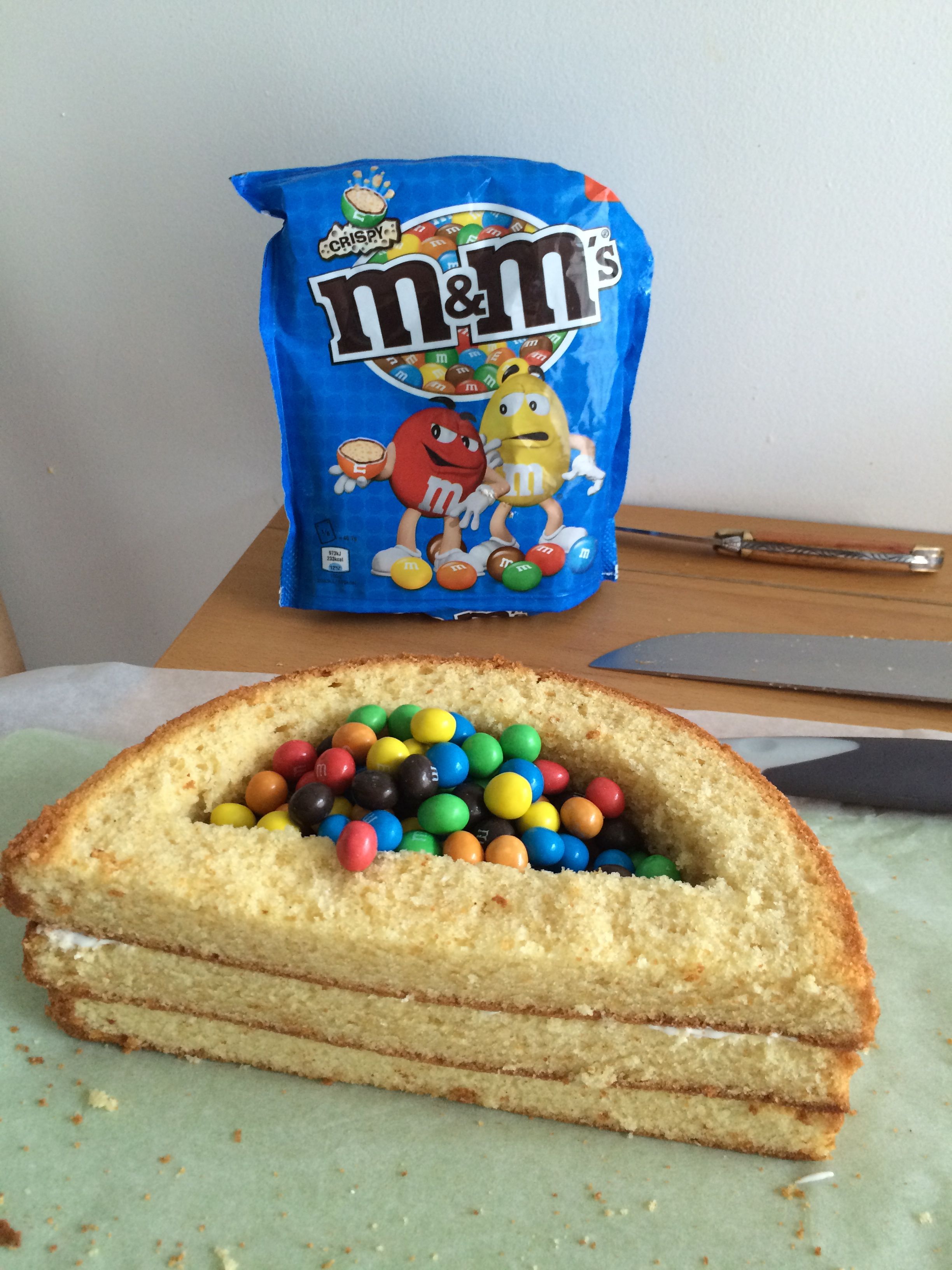 Avant de coller le dernier morceau, j’ai rempli mon gâteau de M&M’s au chocolat. On peut aussi utiliser des bonbons.