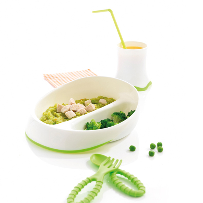 Soit tout le nécessaire pour que bébé puisse manger comme un grand. On aime l’assiette à double compartiments permet de séparer viande et légume pour permettre à bébé de découvrir chaque saveur séparément.