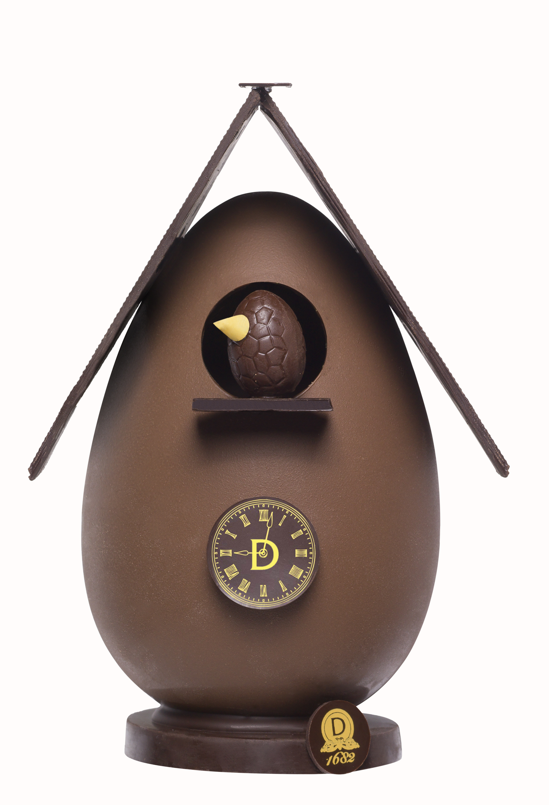 - D’un œuf principal contenant un macaron à partager au chocolat au lait, garni d’une ganache au chocolat acidulé