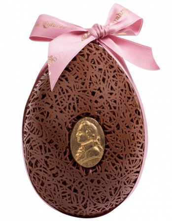 Composition : chocolat noir avec garniture œufs pralinés maison.