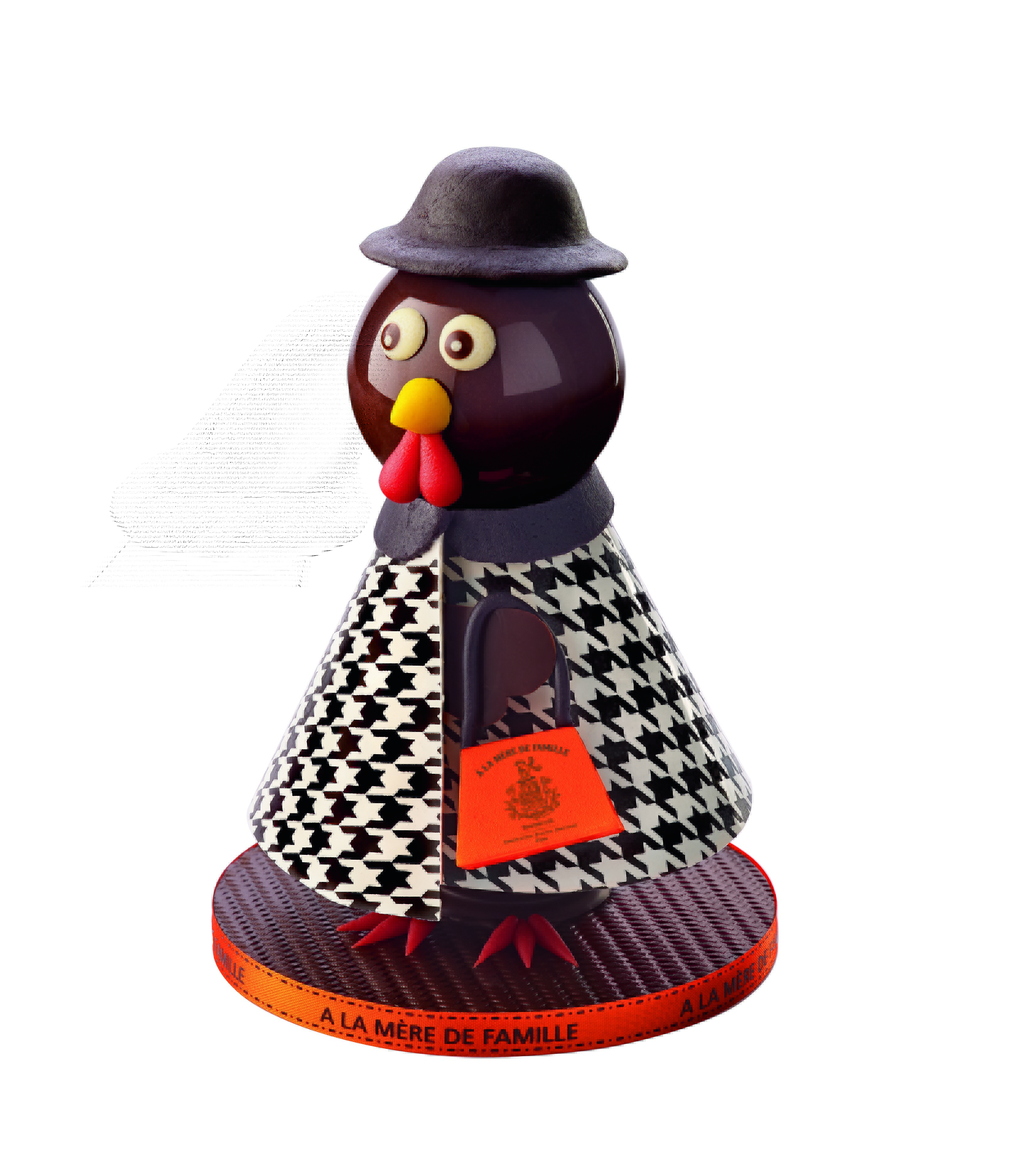 Composition : Chocolat « signature » noir 65% ou au lait 36%. Accessoires, visage et pattes en pâte d’amandes