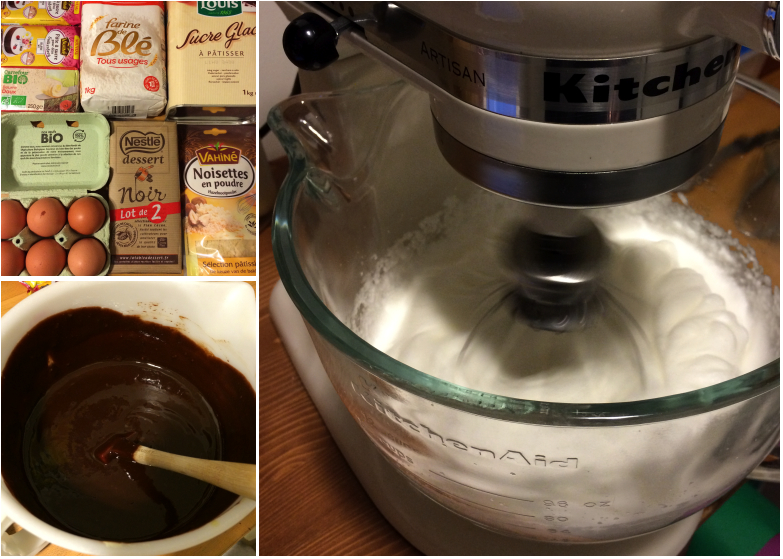Pour ce gâteau piscine on m’a demandé un gâteau tout chocolat. J’ai préparé la veille de l’anniversaire un gâteau au chocolat et aux noisettes ainsi qu’ une ganache au chocolat noir.