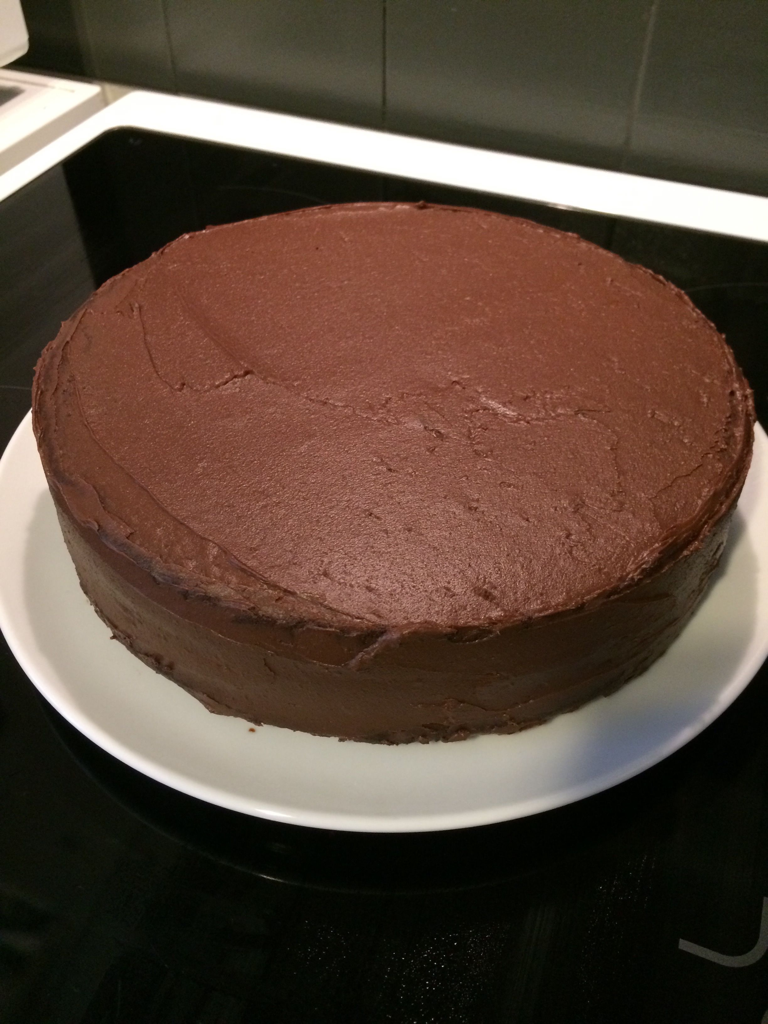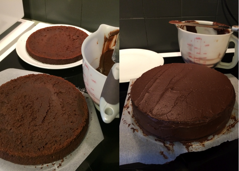 Le lendemain, j’ai fourré et recouvert mon gâteau à l’aide de ganache au chocolat puis je l’ai réservé au réfrigérateur une heure pour que la ganache durcisse bien.