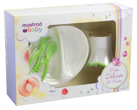 Le coffret P’tits délices contient tout ce qu’il faut à votre bébé pour commencer à manger tout seul dans les meilleures conditions : une tasse, des couverts, une assiette, une timbale. Ce que l’on aime ce sont les formes arrondies qui ne blessent pas les gencives et la légèreté des objets qui sont aussi faciles à prendre en main.