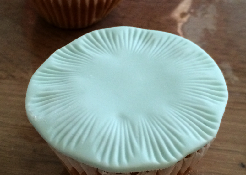 Pour recouvrir le cupcake dont on aura préalable coupé le dessus pour obtenir un surface plate, il faudra former un disque de pâte à sucre bleue claire que l’on travaille légèrement sur le bord soit à l’aide d’un outil spécifique pour la pâte à sucre soit à l’aide d’un cure-dent comme ci-dessous.