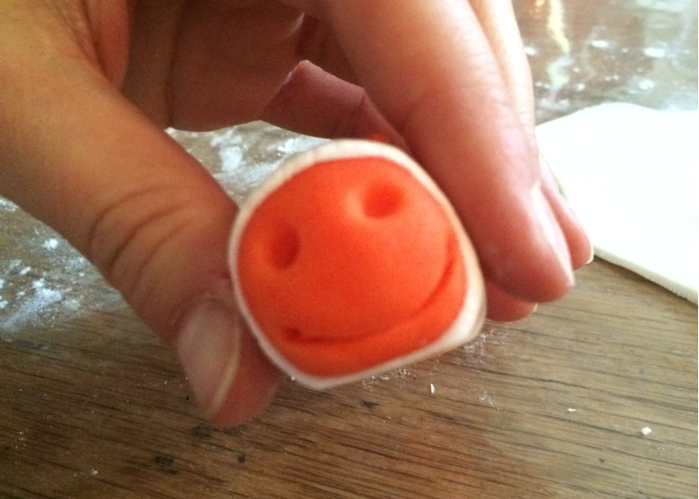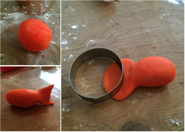 Travaillez la pâte à sucre orange pour qu’elle soit souple et malléable. Formez un boudin puis formez une marque au 2/3 du boudin qui lorsque vous l’aurez aplati deviendra la queue du poisson. Utilisez un emporte-pièce rond pour découper la queue et affiner ensuite cette partie.