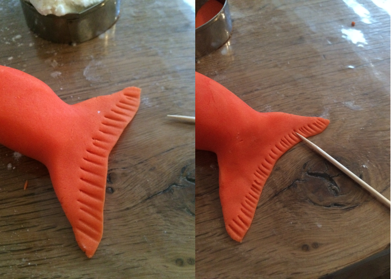 Pour pouvoir lui donner cet effet de voile, utilisez ensuite un cure-dent pour faire de petites marques tout le long de la queue. Les miennes étaient un peu trop petite d’un côté de la queue mais je me suis rattrapée avec des marques plus grandes de l’autre côté. Il faut faire attention de ne pas couper la pâte à sucre.