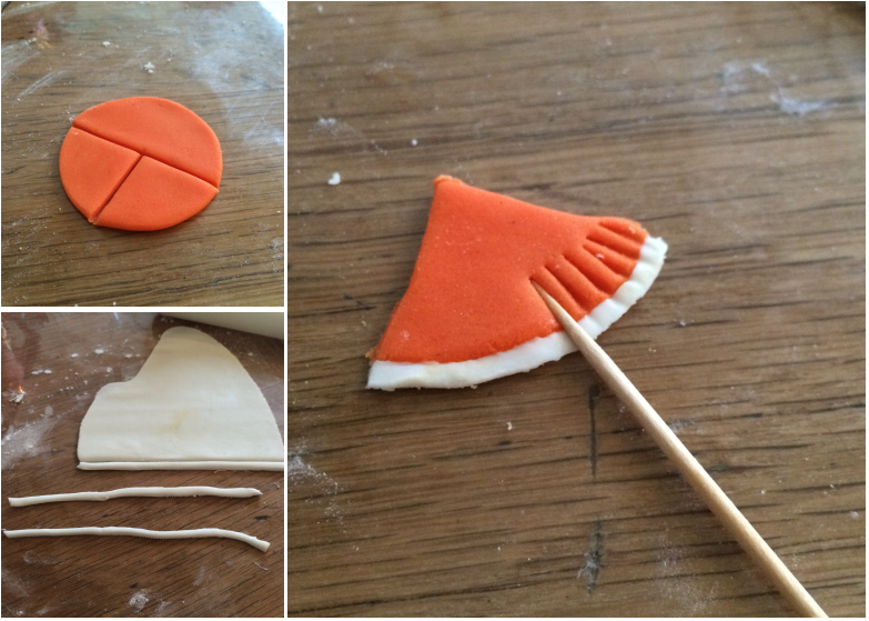 Formez une boule de pâte à sucre orange et étalez la pour obtenir un disque que l’on coupera comme ci-dessous. Préparez également de petites bandes de pâte à sucre blanche que l’on viendra fixer au bord de la nageoire. Comme pour la queue du poisson, utilisez le cure-dent pour faire quelques marques qui permettront de donner du mouvement à la nageoire.