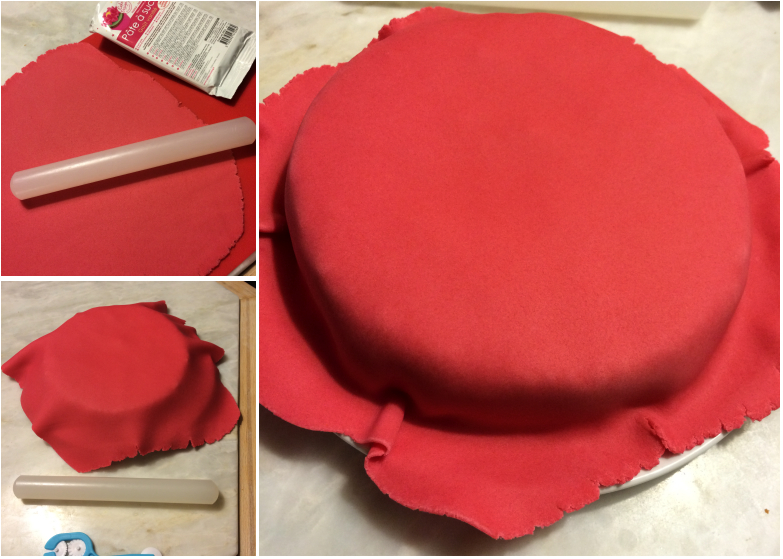 J’ai tout d’abord étalé ma pâte rose au rouleau. J’ai ensuite déposé mon disque de pâte à sucre sur le dessus du grand gâteau avant de l’étaler délicatement. J’ai passé le rouleau pour appuyer légèrement de façon uniforme. J’ai ensuite fait ma découpe à la roulette ce qui permet d’avoir un résultat très net.