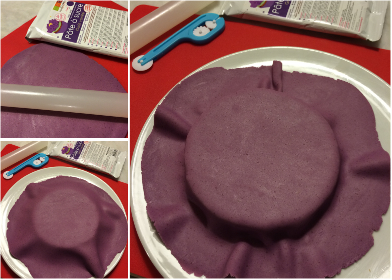 Il faut ensuite renouveler l’opération avec la pâte à sucre violette sur le deuxième gâteau.