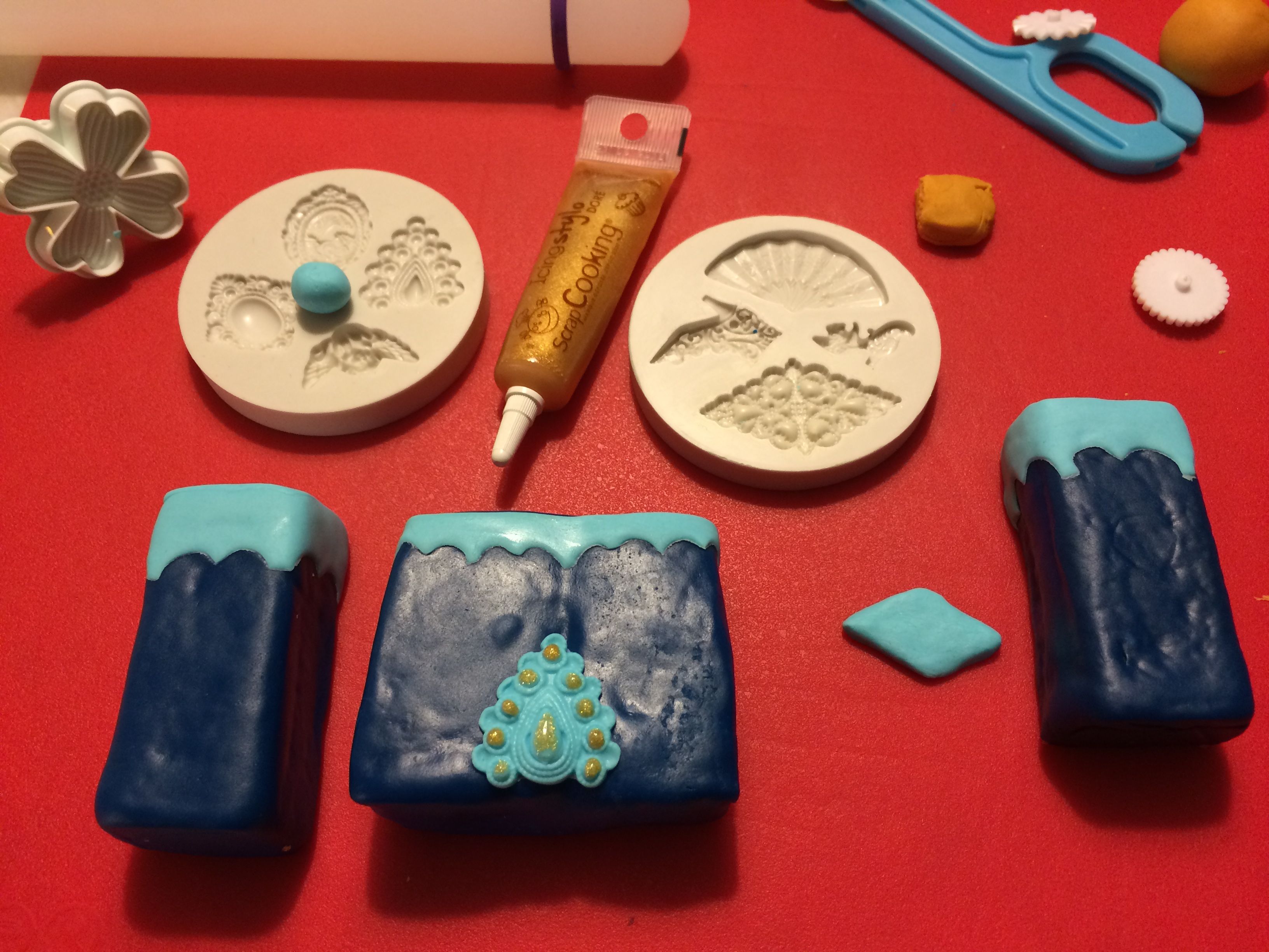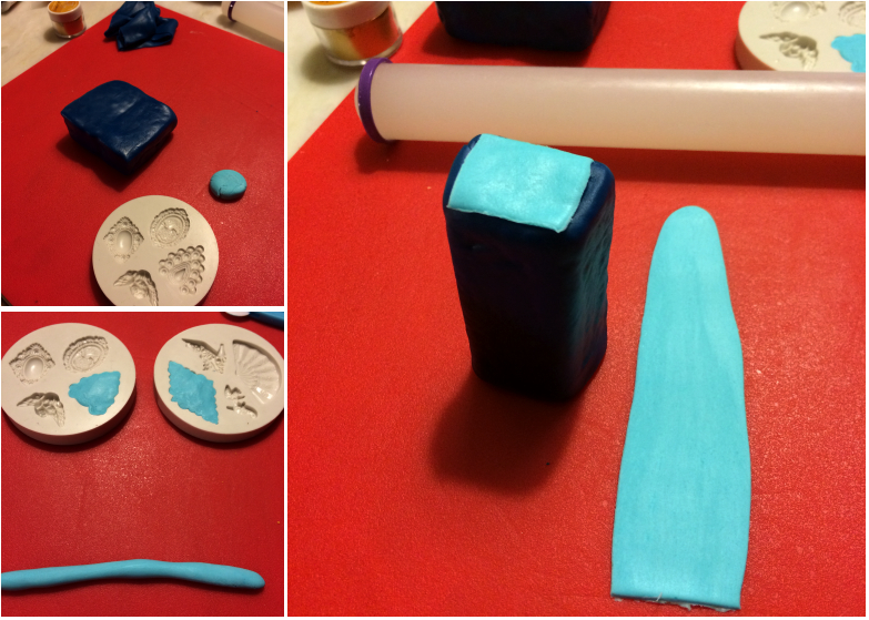 J’ai ensuite recouvert le dessus de pâte à sucre bleu ciel. J’ai également réalisé quelques décorations à l’aide de petits moules en silicone.